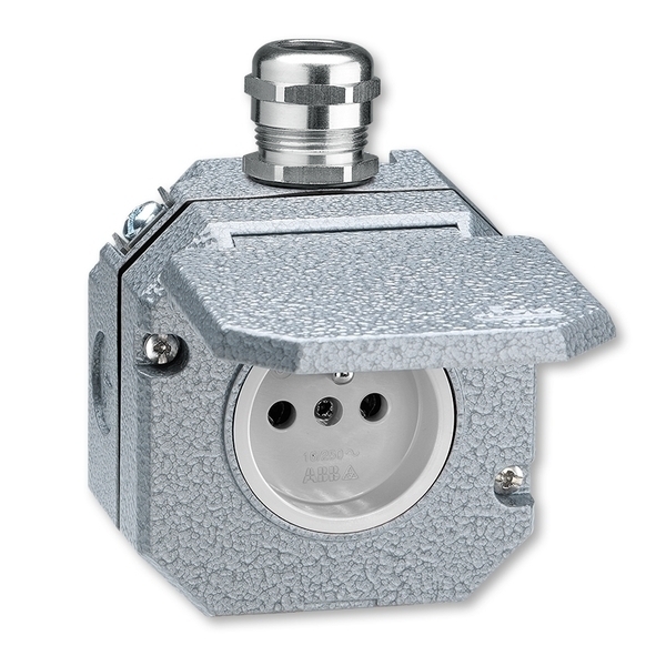 5518-2760 Zásuvka jednonásobná IP55, Al, s ochr. kolíkem, s víčkem a kovovou průchodkou, šedá (Garant)