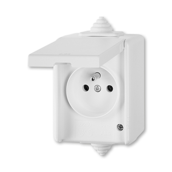 5518-2969 B Zásuvka jednonásobná IP44, s víčkem, pro průběžnou montáž, bílá (Praktik)