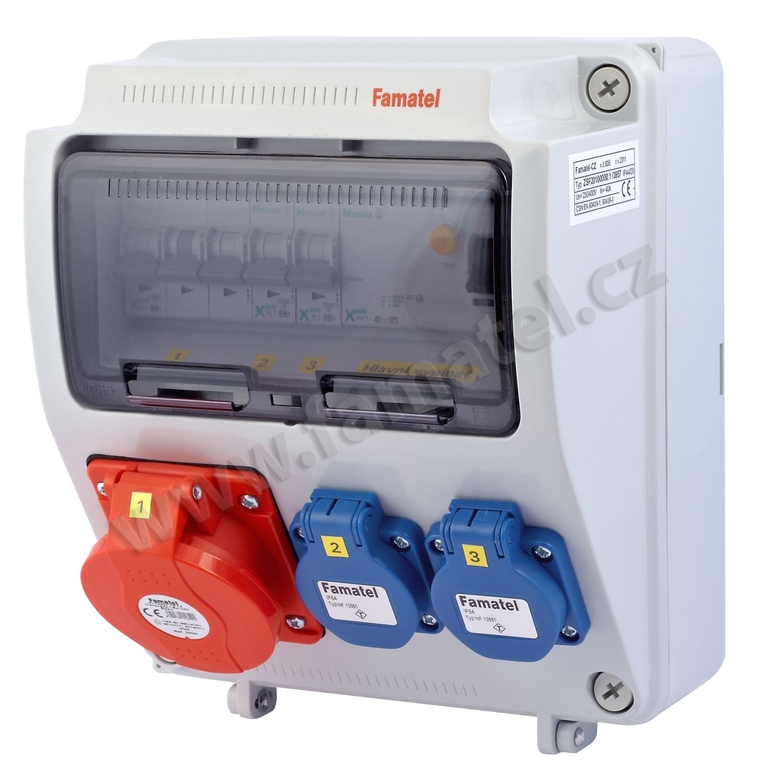 FAMATEL zásuvková kombinace ZSF 20100000.1 /3957 jištěná s chráničem 2x230V, 1x16/5 245x215x155