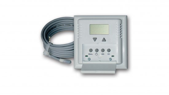 LCD display bez podsvícení, uživatelsky volitelné snímaní teplot - jen prostoru, podlahy, nebo obou hodnot. Týdenní program - až 6 teplotních změn denně, režim ručního ovládání, protimrazové ochrany nebo úplné vypnutí. Možnost uzamčení ovládání, spínací kontakt 16A, krytí IP 21, podlahová sonda 3m je součástí balení. Umístění na na KU 68.