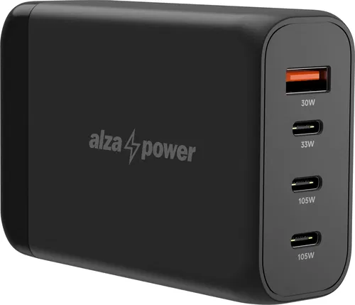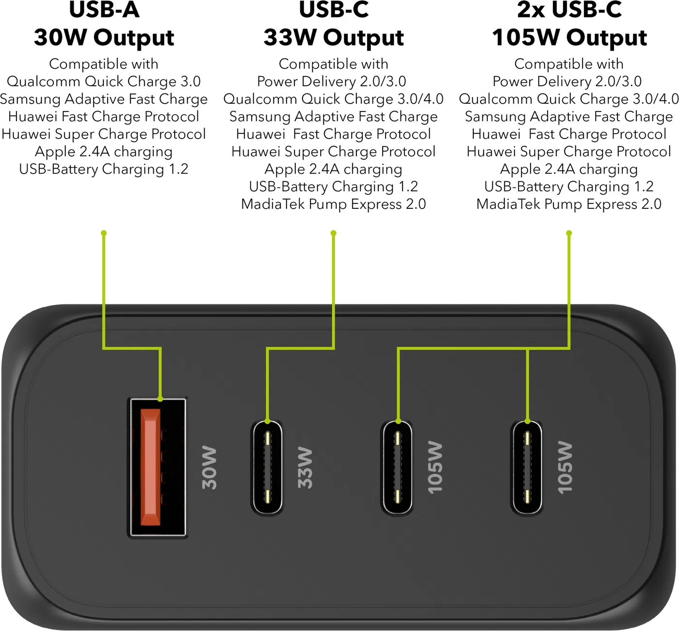 Napájecí hub - s podporou rychlého nabíjení, GAN, celkový výkon 130 W, výstupy 2× USB-C (max. 100 W), 1× USB-C (max. 63 W) a 1× USB-A (max. 30 W), technologie rychlého nabíjení Quick Charge, USB Power Delivery, QuickCharge 2.0, QuickCharge 3.0, QuickCharge 4.0+ a Adaptive Fast Charging, podpěťová ochrana, přepěťová ochrana, součástí balení 1m kabel